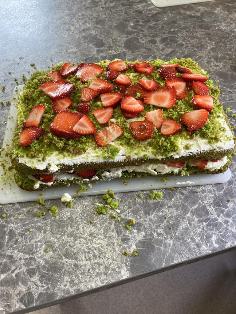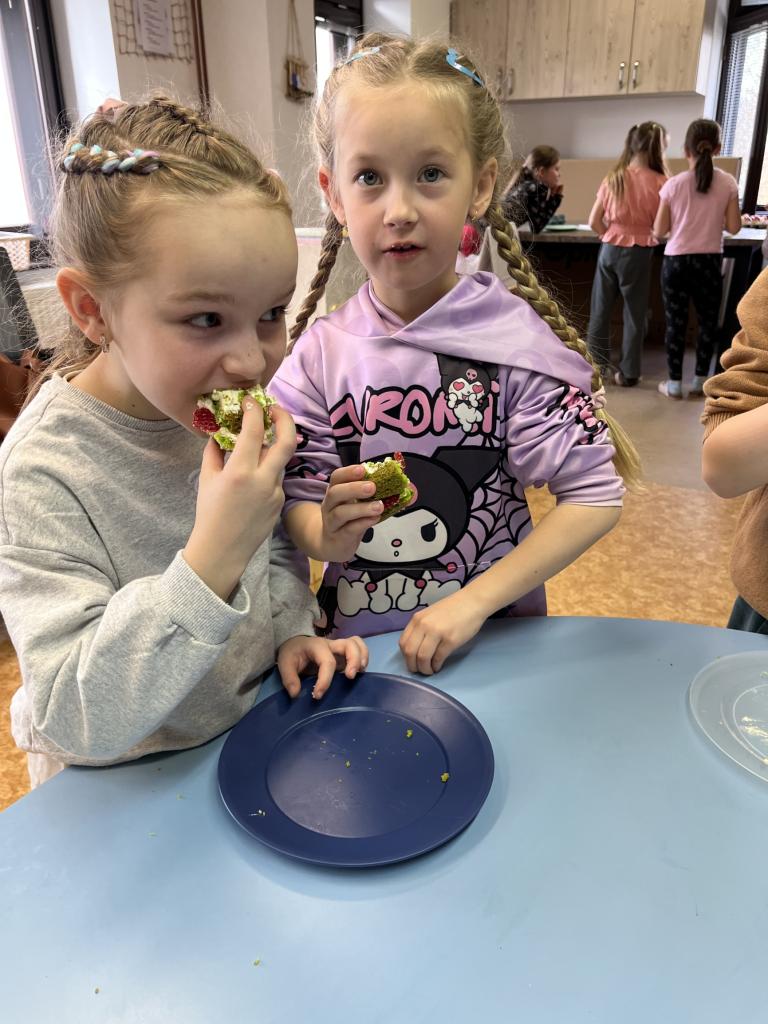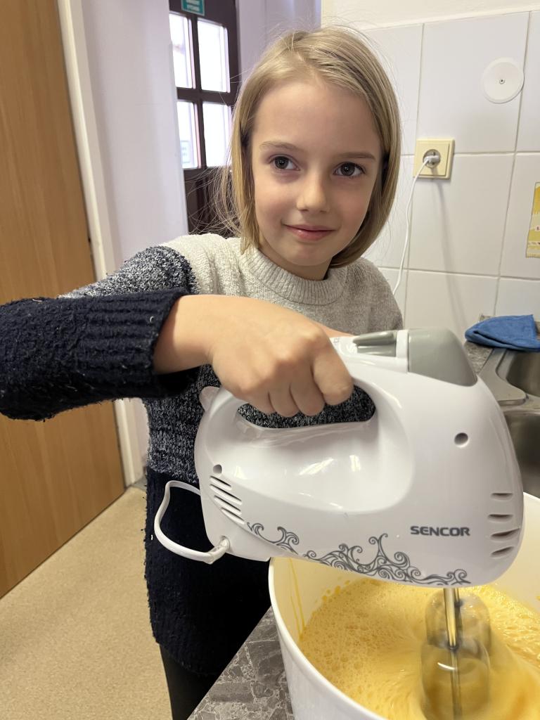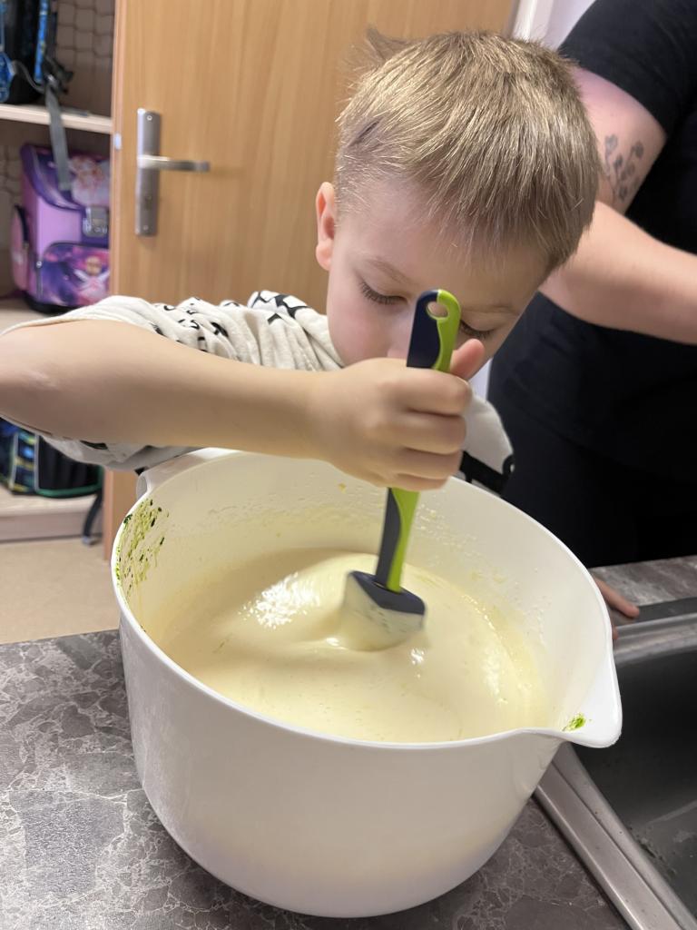 Jako každý měsíc si děti procvičily vážení surovin, míchání, krájení i rozklepávání vajíček. Některé si také vyzkoušely vajíčka vyfouknout, protože se blíží Velikonoce. Přestože byl dort ze špenátu, děti si na něm moc pochutnaly!