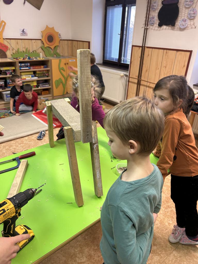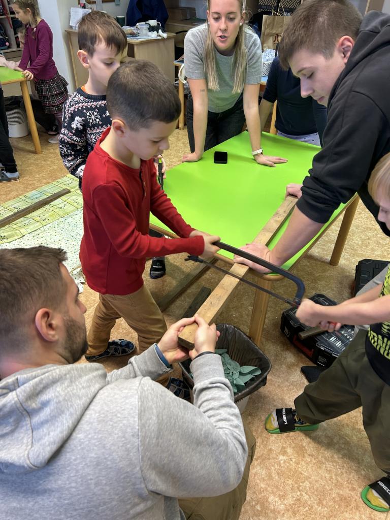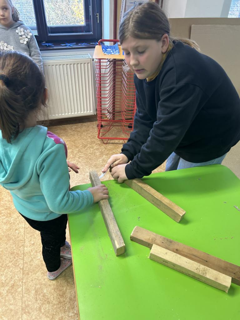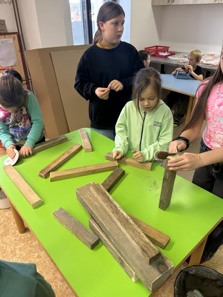 Děti si s pomocí Pepy a Honzy vyrobily konstrukci těl sobíků. Bylo krásné sledovat, jak jsou děti šikovné a jde jim práce od ruky. Sobíci, kteří dostanou ještě jehličnatý kabátek, budou zdobit vchody školy a vítat tak všechny, kteří do budovy vejdou, nebo jen projdou kolem.